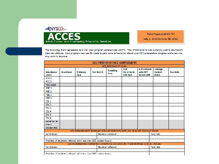 Now Current System: Students are assessed at Intake Determination is made: Does student have the goal of attaining a High School Equivalency Diploma __yes __no If YES, then assign the goal of “Obtain GED” Second Question – Does the student also have the goal of entering Postsecondary Education or Training? If YES, assign goal (50% target) Let’s compare July 1, 2012 Changes to System: Students are assessed at Intake Determination is made: All learners who have a GED, a secondary credential, or are enrolled in a class specifically designed for transitioning to postsecondary education (e. g. , bridge program, college readiness), as the cohort for which “Entry into Postsecondary Education” must be tracked. Students included in the cohort are those who passed the GED tests or earned a secondary credential while enrolled in adult education, enter with these credentials, or are enrolled in a class specifically designed for transitioning to postsecondary education.