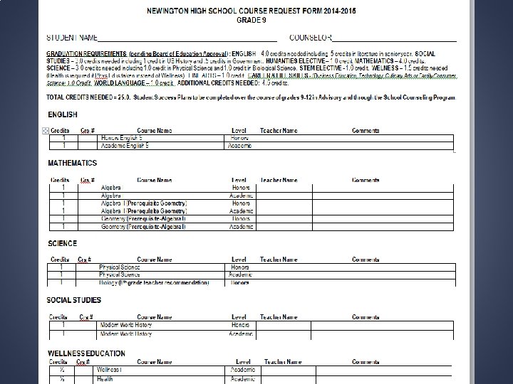 REQUIREMENTS SUBJECT COMPREHENSIVE REQUIREMENTS COLLEGE English 4. 0 ½ in Literature Sr. Year 4+ Social Studies 3. 0 1 US History/. 5 Government 3 -4 Humanities Elective 1. 0 Math 4. 0 Science 3. 0 STEM Elective 1. 0 Career / Life Skills 1. 0 Fine Arts Business Ed. , Tech. , Family/Consumer Science/Academy Courses 1. 0 Music & Art World Language 1. 0 Wellness 1. 5 Additional Credits Needed 4. 5 TOTAL: 25. 0 4 1 Phy Science / 1 Bio Science 3 -4 2 -4 Grades 9 -11