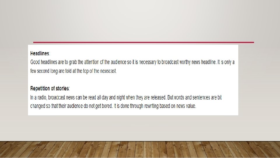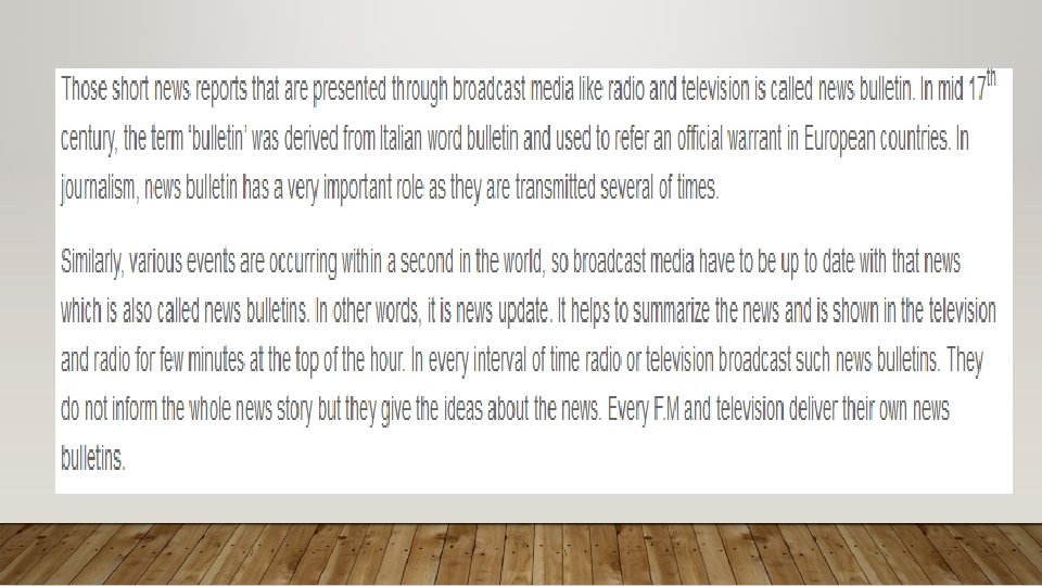 NEWS BULLETIN FOR RADIO • The principles of bulletin preparation: Radio bulletins are usually made up from three types of material: • written stories in the form of a script; • voice reports from journalists, either recorded or live; • recorded sound called actuality. This is usually the sound of someone speaking, perhaps taken from an interview or a speech. A short segment of actuality is called a grab. Grabs are used in a similar way to quotes in a newspaper story. In some countries, grabs are called cuts or inserts.