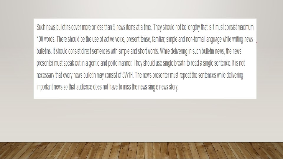 PACE • By pace we mean the length and tone of a story as it appears to the listeners. • Some stories have a fast pace. The report of a fire, for example, will usually be written in short sentences, using short snappy words to convey simple ideas. It will have a fast pace. • Too many long complicated stories will slow the pace of the whole bulletin and allow the attention of your listeners to wander. Too many short, sharp stories may leave listeners confused, unable to keep up with the pace of changing stories.