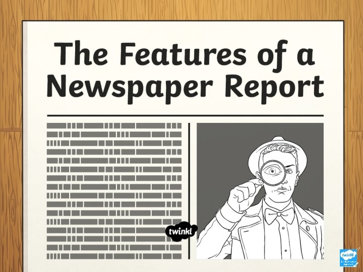 TWINKL TIMES newspaper at the top of the page. An interesting headline. Take a look at this example, how many features can you. Next find? Next Write in the third person and past tense. An introductory paragraph that includes the five Ws. Next A final concluding paragraph explains what might happen next. Facts about the main events. Next Quotes are written as direct speech. What features do you need to remember to include in name of the TWINKL TIMES your newspaper The report? Next Captions are added to pictures. Next