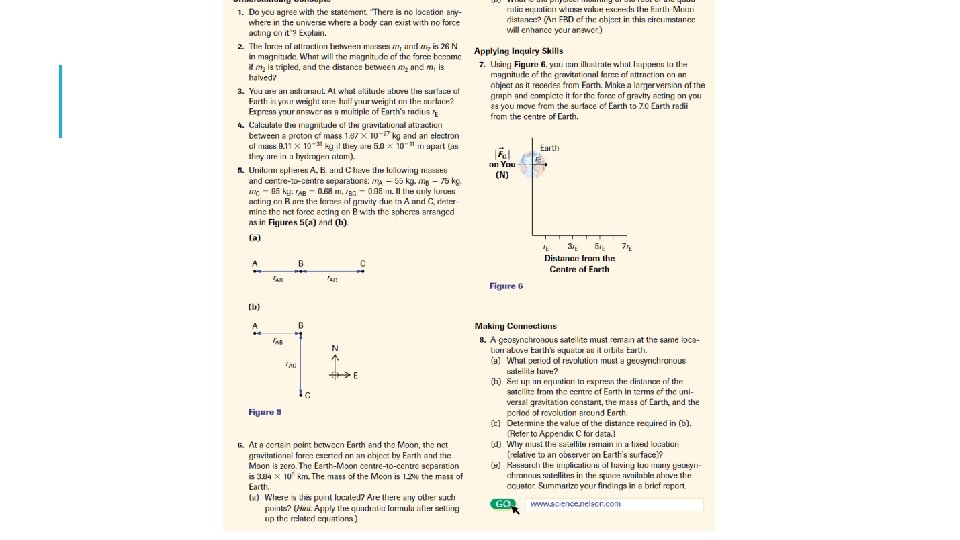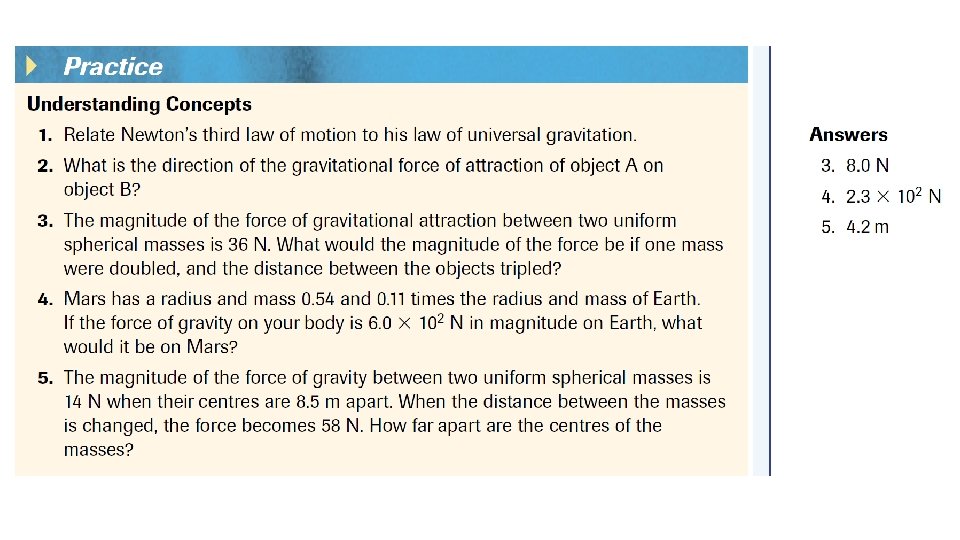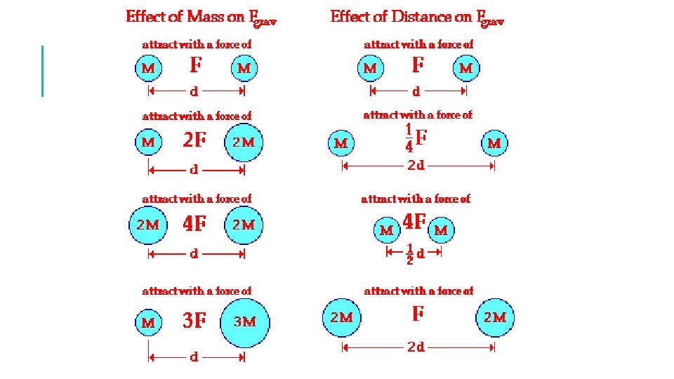 NEWTON’S LAW OF UNIVERSAL GRAVITATION Where: Fg = magnitude of the force of gravity (in N) G = 6. 67 X 10 -11 N • m 2/kg 2 M = mass of one object (in kg) m = mass of other object (in kg) r = distance between centres of masses (in m)