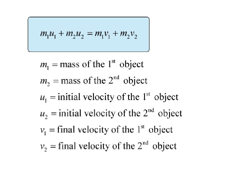 6. The Law of __________ of momentum states that the total momentum of an isolated system before collision is always equal to total momentum after collision 7. Which of the following situations best illustrates this Law? a) a large ball is used to knock a smaller ball off a table b) a cannonball is launched from a cannon c) a rocket is propelled upward when the engine fires 8. Which has more momentum? a) 5 kg toy car traveling at 3 m/s b) 5 kg toy traveling at 6 m/s 9. In an elastic collision, objects will _______ 10. Who developed the Laws of Motion? ______