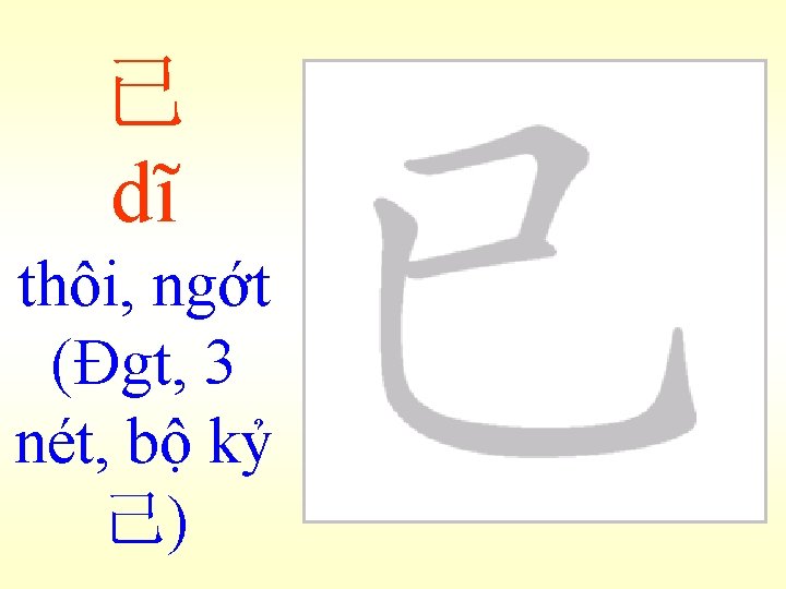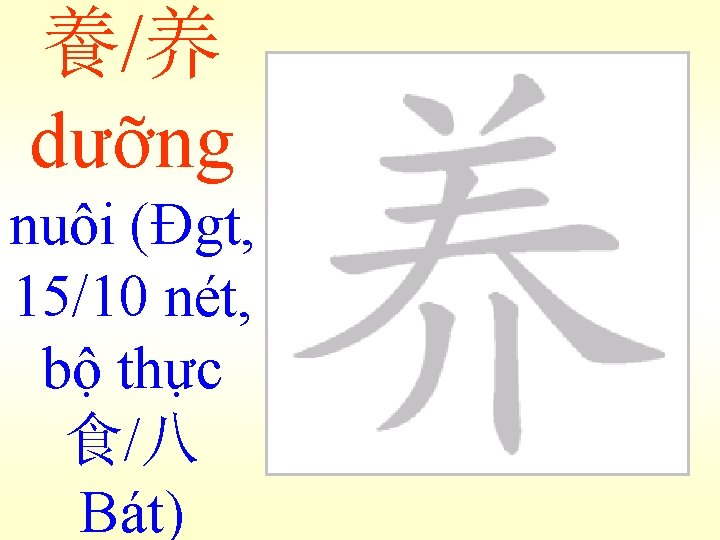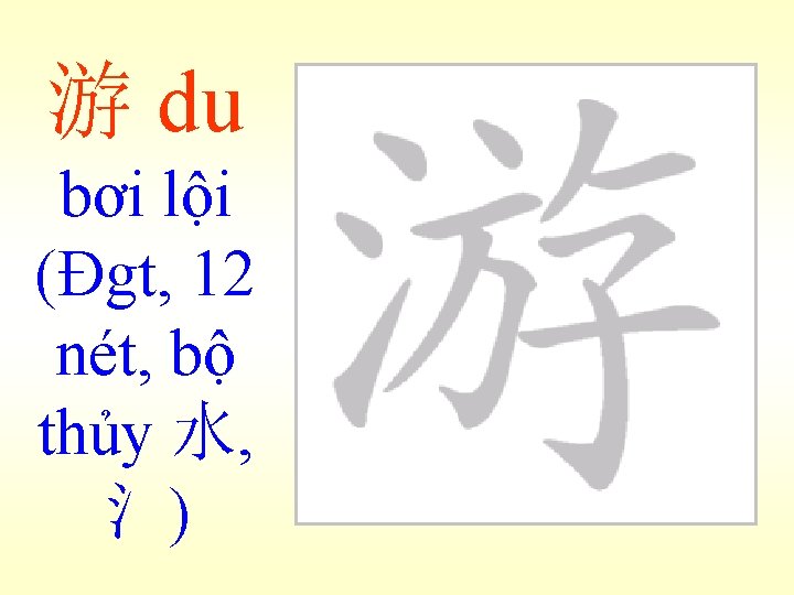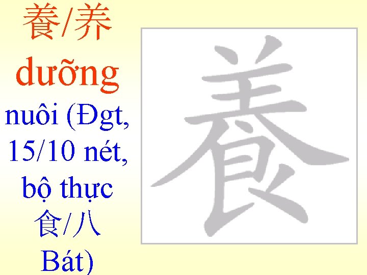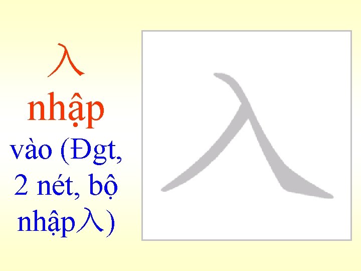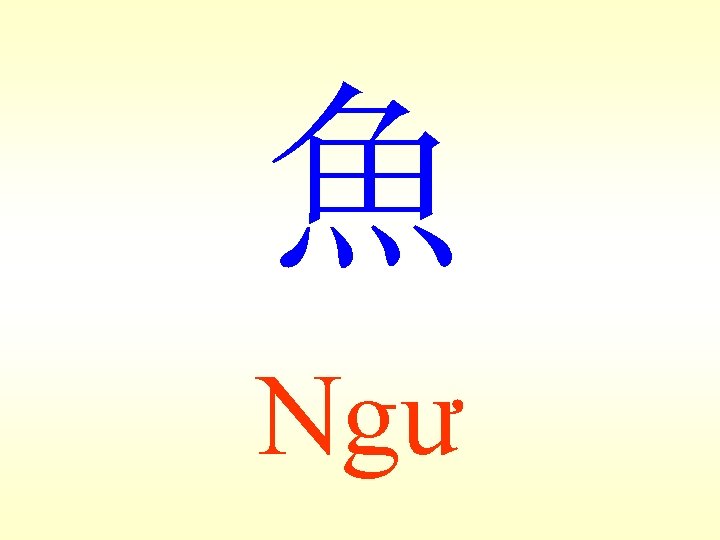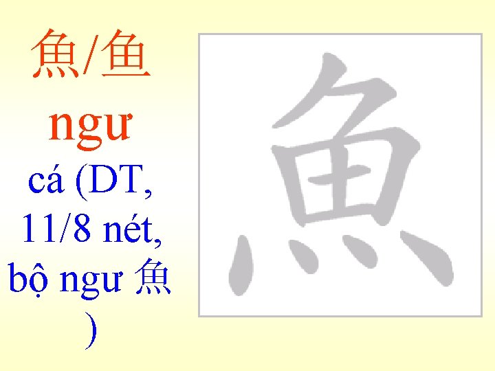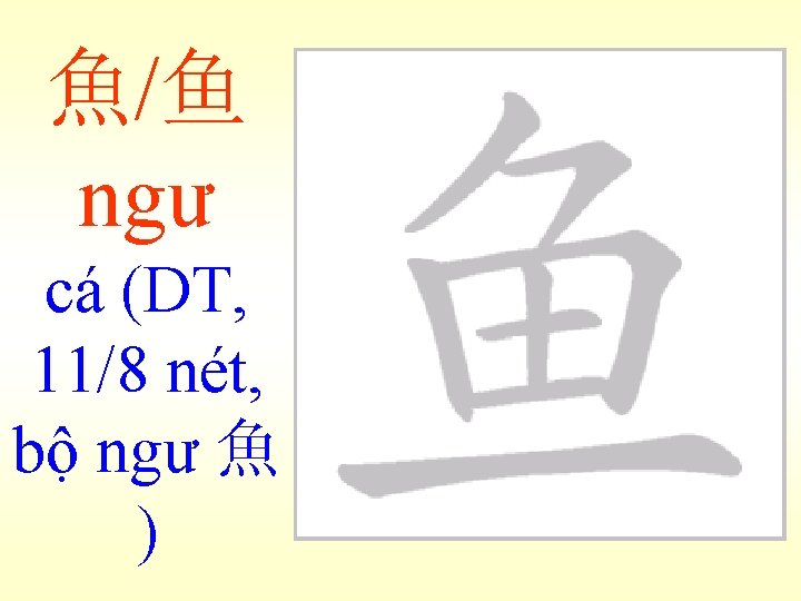 魚ngư 老人買魚 Lão nhân mãi ngư: Ông già mua cá. (bài 24) 魚肉-木魚 Ngư nhục : Như cá trên thớt, không có sức kháng cự. Mộc ngư: Cái mõ, làm theo hình con