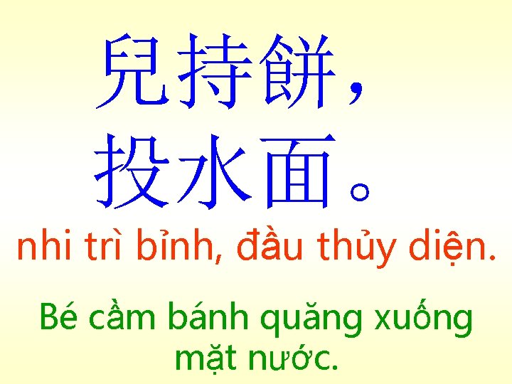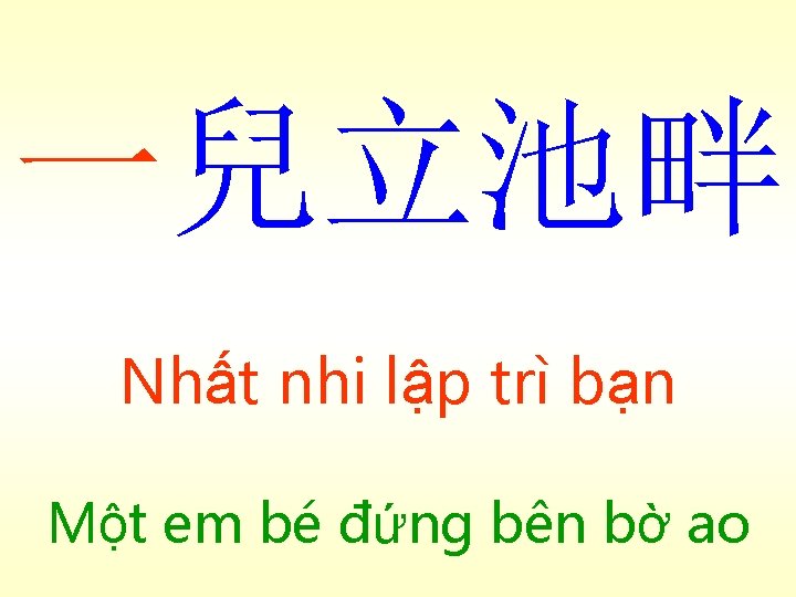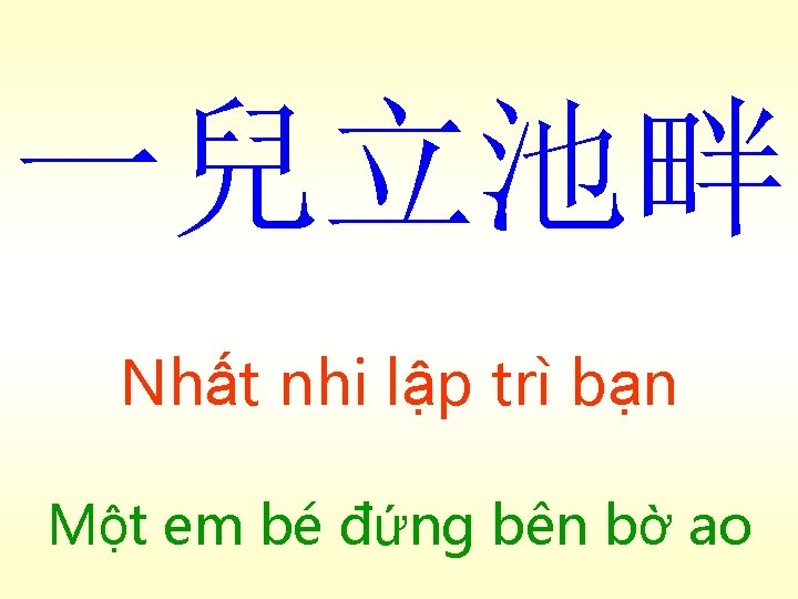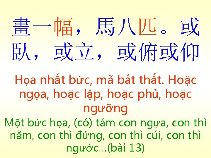 庭前樹有鳥巢。小 鳥一群,樹間飛鳴 Đình tiền thụ, hữu điểu sào. Tiểu điểu nhất quần, thụ gian phi minh (Trên) cây trước sân, có tổ chim. Một bầy chim nhỏ, vừa bay vừa kêu giữa các cây (bài 12)