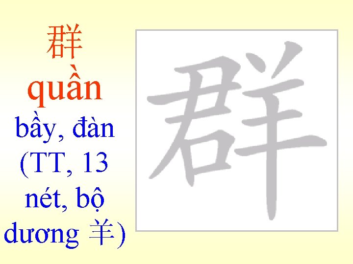 群quần: là hình dung từ thường đặt trước danh từ để biểu thị số nhiều, có thể dịch là "bầy" hoặc "những"