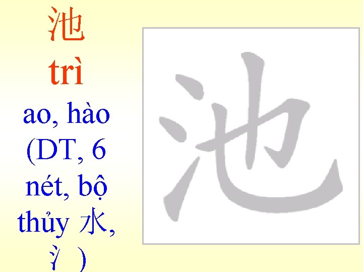池trì 魚池 -游泳池 城池 -高城深池 Ngư trì: ao cá, du vịnh trì: hồ bơi. Thành trì: thành và hào nước ở bên ngoài để che chở. cao thành thâm trì: Thành cao ao sâu. Ngb (Nghĩa bóng) Việc phòng thủ vững chắc.