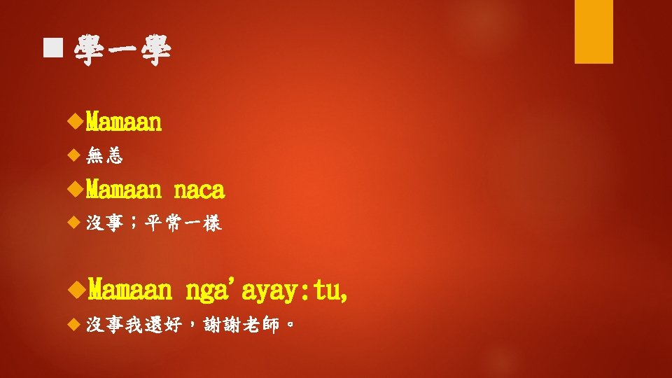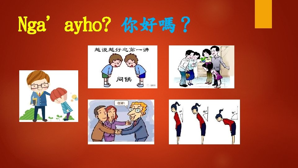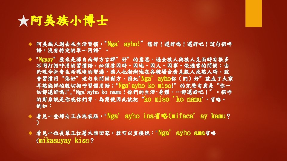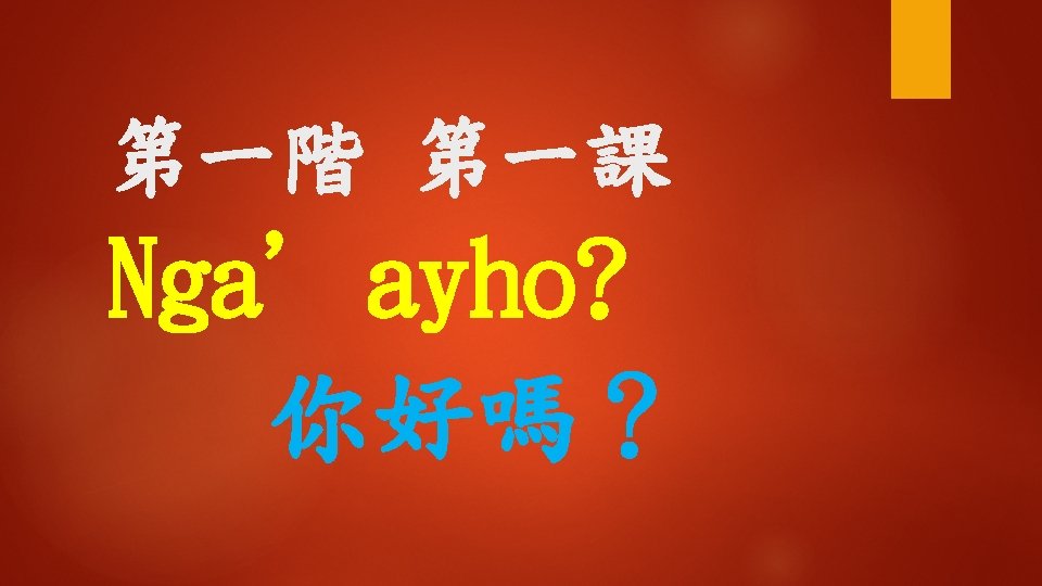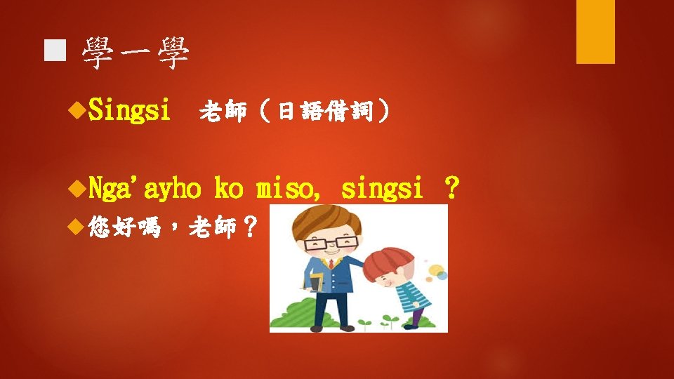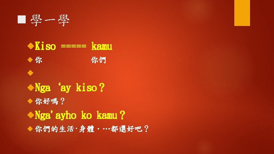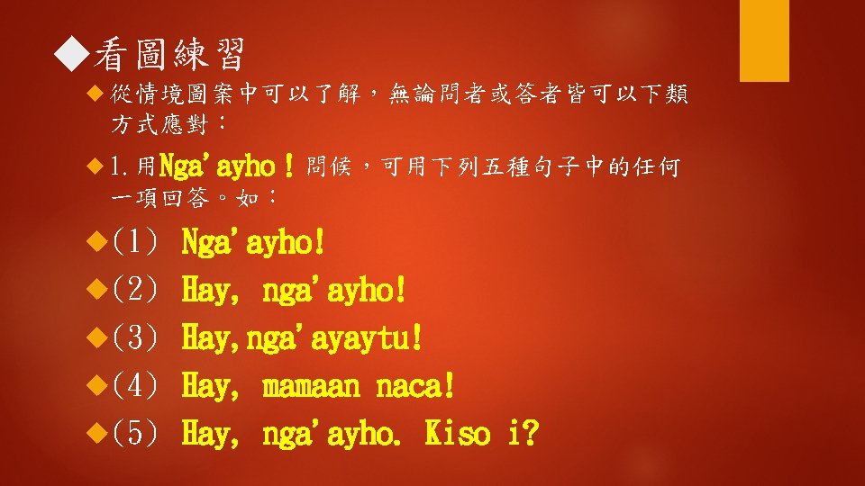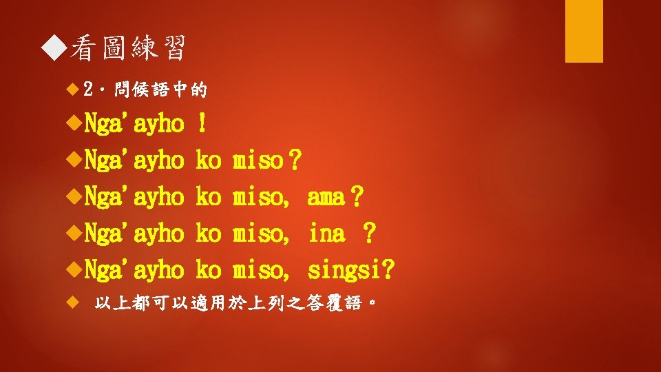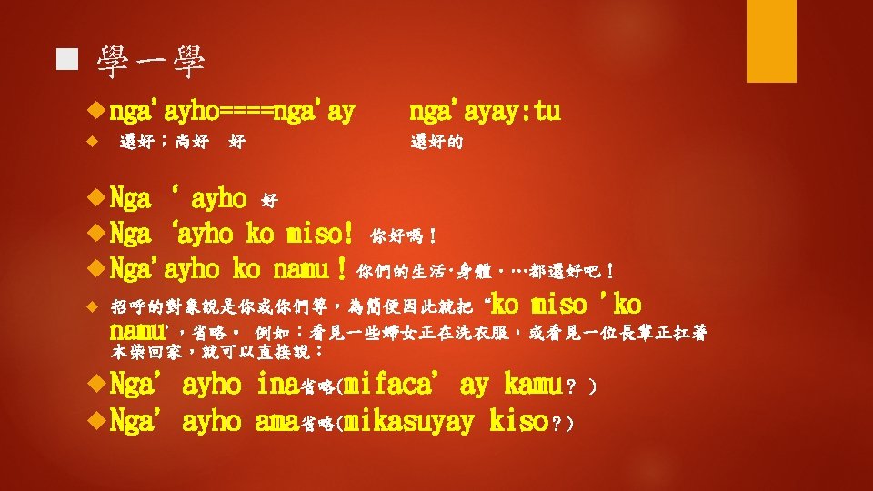 Ngaayho ko miso singsi Hay ngaayho Kiso i Slides: 16 Download presentation ◆聽一聽 Nga'ayho ko miso, singsi ? 您好嗎,老師? Hay, nga'ayho. Kiso i? 是的,我還好。那你呢? Mamaan nga'ayay: tu, awiday singsi. 沒事我還好,謝謝老師。 n 學一學 hayy‘i 是;是的 是的;確定的 (1) Nga‘ayho! (2) Hay, nga' ayho. (3) Hay, nga'ayaytu. (4) Hay, mamaan-naca. (5) Hay, uga'ayho. kiso? n 學一學 Awiday 謝謝 Ahuwiday 謝謝(讚美) a. Kuwiday Mamaan 非常謝謝 nga'ayay: tu, awiday singsi. 沒事我還好,謝謝老師。 ◆句型練習 1. 問:Nga'ayho ko miso? 答:Hay, nga'ayho. 2. 問:Nga'ayayho ko miso ina? 答:Nga'ayay: tu kako. 3. 問:Nga'ayho ko miso ama? 答:Mamaan naca, nga‘ayho ! ◆補充會話 A: Nga' ayho! B: Nga'ayho! A: Nga'ayho! B: Hay, nga'ayho! A: Nga'ayho ko miso? B: Hay, Nga'ayho ko miso! ◆補充會話 A: Nga'ayho ko miso kaka? B: Hay, mamaan. Kiso i? A: Nga'ayay: tu. A: Nga'ayho! B: Mama: an naca, o yanatu.