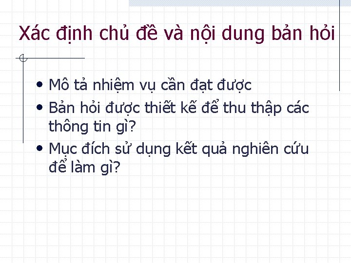 Cấu trúc bản hỏi • Thứ tự câu hỏi rất quan trọng • Building trust: đơn giản, dễ trả lời trước, câu hỏi khó sau • Trình bày: dễ hiểu, các phần tách biệt rõ ràng, sử dụng hình ảnh, lo go minh hoạ…