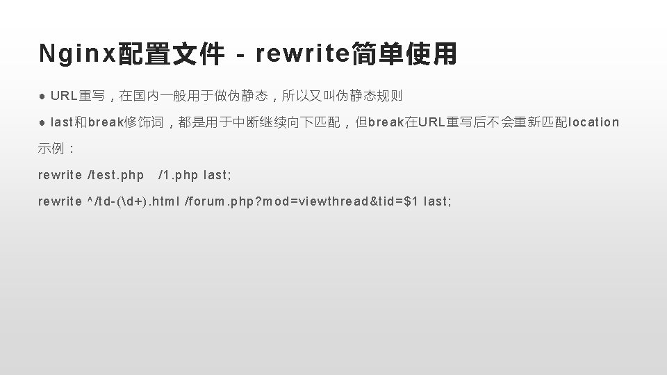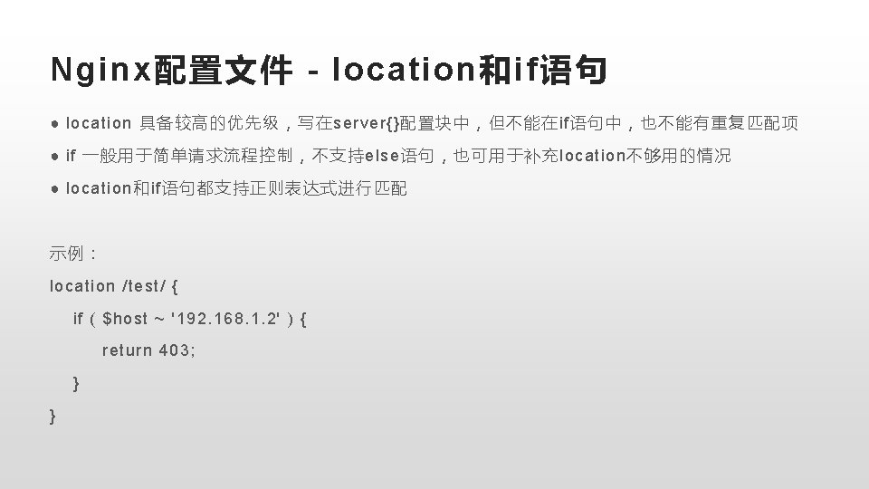 Nginx配置文件 - 主配置文件 ● 主配置文件位置在. /conf/nginx. conf ● 配置结构: http { //HTTP服务器对像 //HTTP全局配置 default_type application/octet-stream; client_max_body_size 50 m; include /www/server/panel/vhost/nginx/*. conf; / /支 持 i n c l u d e 语 句 . . . server { // 主机 listen 80; server_name test. com; root /wwwroot/test. com; include /www/server/panel/vhost/rewrite/test. com. conf; . . . } } / /支 持 i n c l u d e 语 句