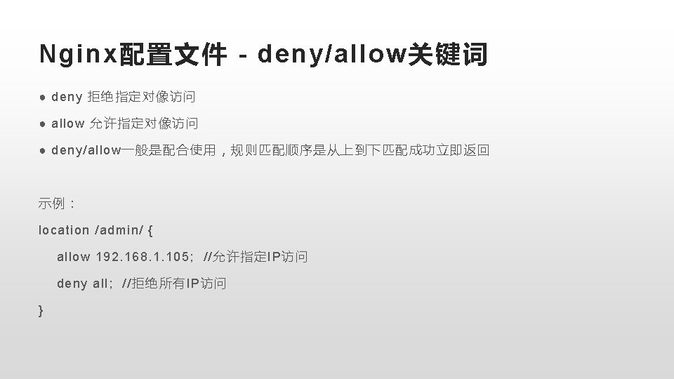 Nginx配置文件 - HTTP全局配置 ● default_type 无法自动识别mime时的缺省响应类型 ● client_max_body_size 客户端最大请求体大小(如:上传文件) ● keepalive_timeout HTTP连接超时时间 ● fastcgi_connect_timeout Fast. CGI连接超时时间 ● fastcgi_send_timeout Fast. CGI请求发送超时时间 ● fastcgi_read_timeout Fast. CGI请求接收超时时间 ● gzip/gzip_comp_level/gzip_types GZIP 压缩相关设置 ● log_format 日志格式定义,示例: 示例:log_format log_test '$remote_addr - $remote_user [$time_local] "$request" ' '$status $body_bytes_sent "$http_referer" ' '"$http_user_agent" $http_x_forwarded_for '"$request_time"';