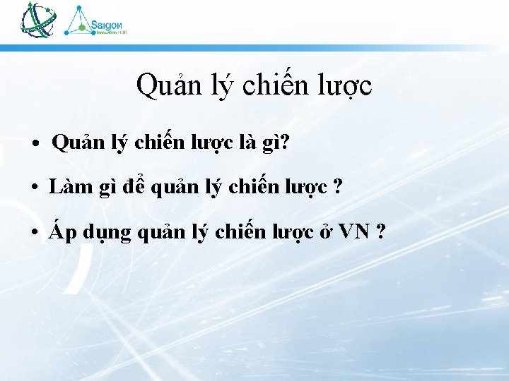 Chiến lược - Hành động để chiến thắng • Môi trường xung quanh như thế nào? • Tổ chức sẽ thay đổi như thế nào để quản lý chiến • • lược thành công? Văn hóa của tổ chức cần phải như thế nào để quản lý chiến lược? (Giá trị-Niềm tin) Vai trò người lãnh đạo trong quản lý chiến lược? (Leadership)