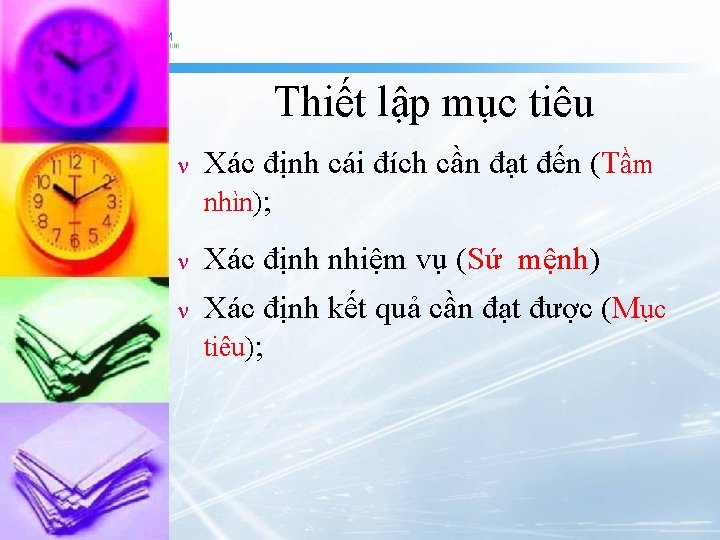 Thiết lập mục tiêu cần phải Mang tính đo lường (Measurable); Có tính khả thi (Feasibility); Tính rõ ràng (Clear); Tính thách thức (Challenge) Dự báo được tác động trong tương lai (Forecast)
