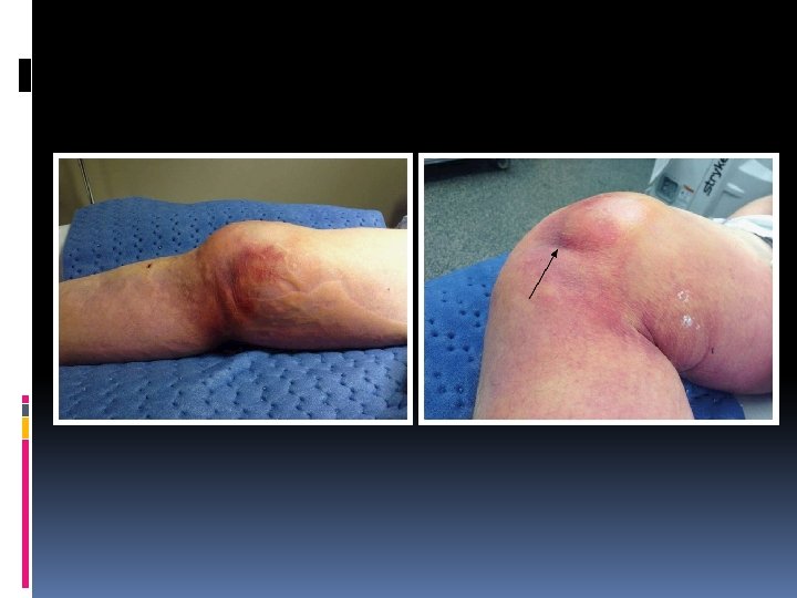 Lâm sàng Dấu hiệu nhăn da tại vị trí khe khớp bên trong gối (dimple sign) Trật bánh chè ra ngoài hay mất vận duỗi khớp gối Nguy cơ tổn thương mạch máu, thần kinh vùng khoeo ít hơn