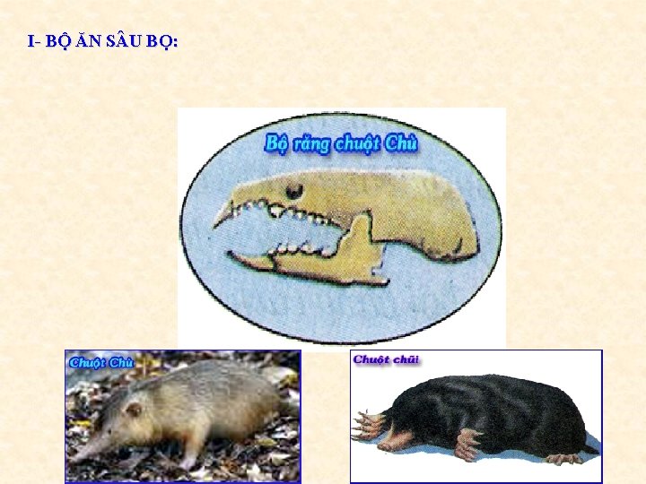 Tiết 52: Bài 50: ĐA DẠNG CỦA LỚP THÚ (tiếp theo) BỘ ĂN S U BỌ, BỘ GẶM NHẤM, BỘ ĂN THỊT I- BỘ ĂN S U BỌ: - Đặc điểm: + Mõm kéo dài thành vòi ngắn + Bộ răng nhọn, sắc. Răng hàm có 3, 4 mấu nhọn cắn nát vỏ cứng của sâu bọ +Thị giác kém phát triển, khứu giác rất phát triển, đặc biệt là lông xúc giác. + Chi trước ngắn, ngón tay khỏe, bàn tay rộng. II- BỘ GẶM NHẤM: - Đặc điểm: + Răng cửa lớn, sắc mọc dài liên tục + Thiếu răng nanh, thiếu răng nănh + Có răng hàm III- BỘ ĂN THỊT: - Đặc điểm: + Răng cửa ngắn, sắc + Răng nanh lớn, dài, nhọn + Răng hàm có mấu dẹp, sắc + Chân: các ngón có vuốt cong, dưới có đệm thịt