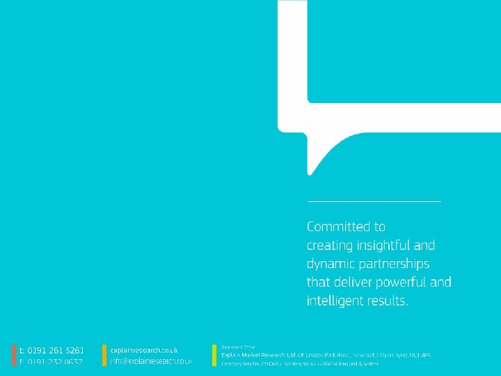 Project background • As with any data collection where a sample is drawn to represent a population, there is a potential difference between the response from the sample and the true situation in the population as a whole (a census). This is known as a standard error which is estimated using statistical calculations based on the sample size and the population size, normally expressed as a confidence interval for the results • To achieve 100% accuracy in results would require the entire population to participate (a census). The usual confidence interval used in market research is 95% which means that you can be confident that in 19 out of 20 instances the actual population behaviour will be within the confidence interval range. The table below gives an indication of the 95% confidence interval for the data within this report at different sample sizes Sample size • • 95% Confidence Interval Sample: 1100 ± 3. 0 Sample: 600 ± 4. 0 Sample: 500 ± 4. 4 Sub-Sample: 100 ± 9. 8 Sub-Sample: 70 ± 11. 7 For example, if a result was 50% we can be confident that the true result if a census was completed for an 1100 sample survey would be actually ± 3. 0 (therefore between 47% - 53%) Please also note that respondents that did not or could not answer a question were removed from the data and therefore the base size in charts fluctuates from question to question