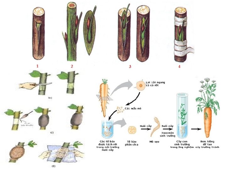 3. Phương pháp nhân giống vô tính Hình thức Ghép chồi, ghép cành Chiết cành Giâm cành Nuôi cấy tế bào và mô thực vật Đối tượng Bưởi, cam, khế, … Mục đích Tạo ra cây mong muốn Cây ăn quả lâu năm Rút ngắn thời gian sinh trưởng và giữ được đặc tính của quả Khoai, sắn, mía, … Rút ngắn thời gian sinh trưởng và giữ được đặc tính của quả Phong lan, chuối, . . Nhân nhanh giống cây trồng mong muốn, tạo ra giống cây trồng khỏe mạnh, năng suất cao