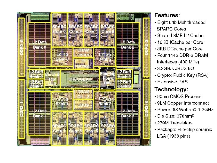 Memory Write through • 16 KB 4 way set assoc. I$/ core • allocate LD • 8 KB 4 way set assoc. D$/ core • no-allocate ST • 3 MB 12 way set assoc. L 2 $ shared – 4 x 750 KB independent banks – 2 cycle throughput, 8 cycle latency – Direct link to DRAM & Jbus – Manages cache coherence for the 8 cores – CAM based directory