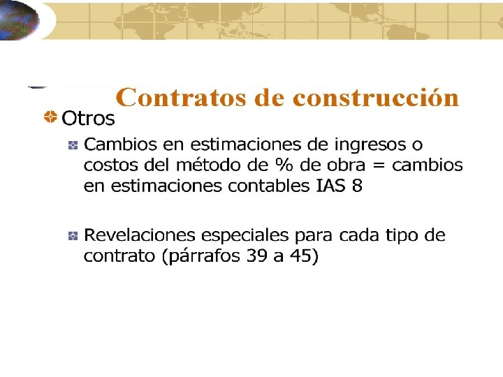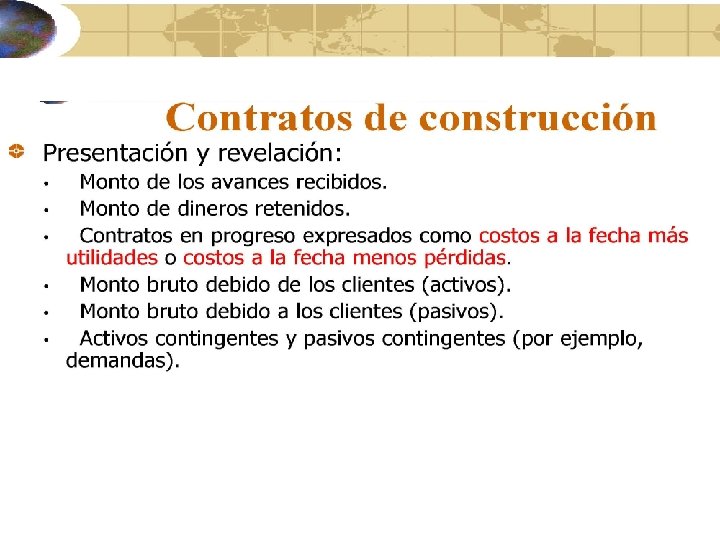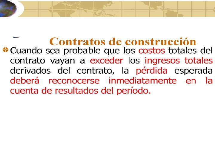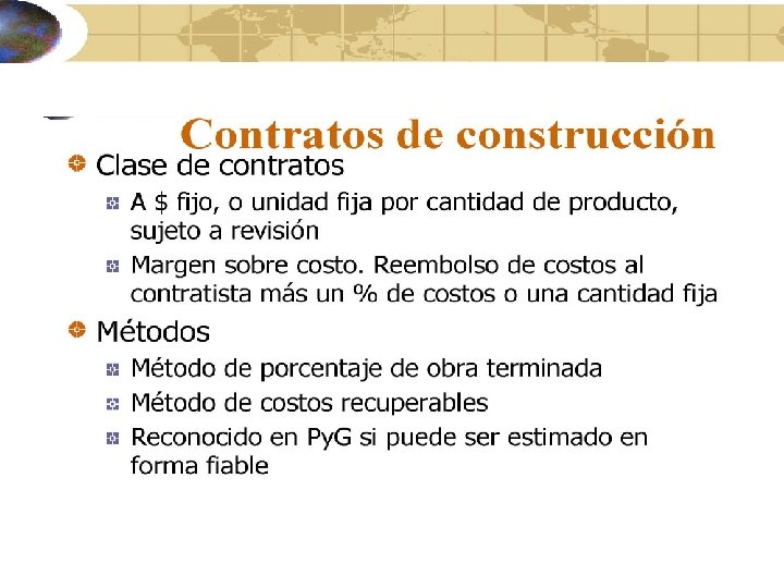 Contratos de construcción Método de porcentaje de obra terminada Reconocido en P y G si puede ser estimado en forma fiable • $ fijo. El resultado del contrato puede ser medido con fiabilidad si se pueden medir los ingresos, se espera obtener beneficios económicos, los costos que faltan para la terminación y el grado de terminación puede ser medido confiablemente y los costos del contrato pueden ser identificados y medidos • Margen sobre costo. El resultado del contrato puede ser medido con fiabilidad si es probable que se obtengan beneficios económicos del contrato y los costos atribuibles al contrato pueden ser claramente identificados y medidos