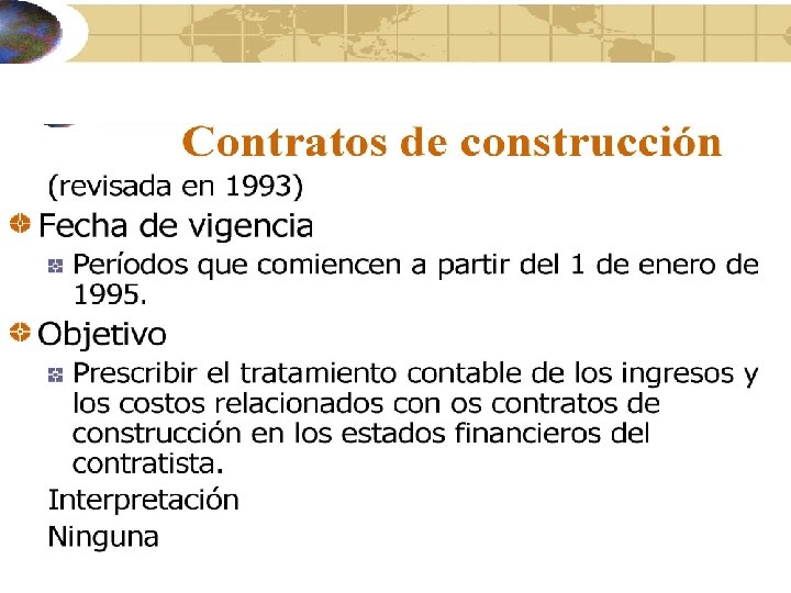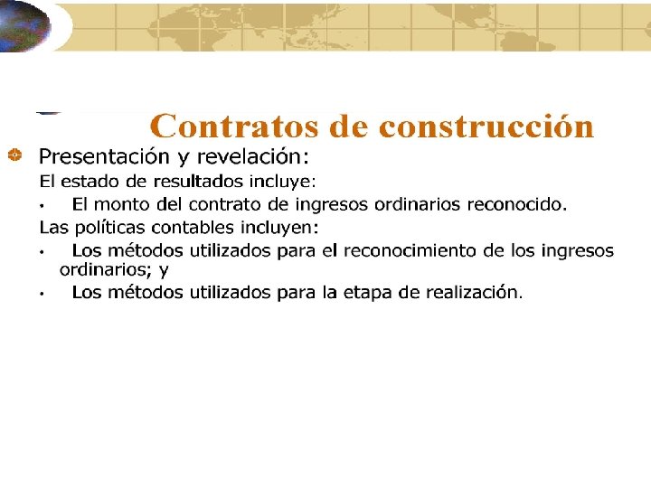 Contratos de construcción Método de porcentaje de obra terminada (cont) Ingresos del contrato se comparan con los costos del mismo y se reconoce los ingresos y costos de la porción del contrato ya ejecutado. La porción se puede determinar con base en los costos incurridos o el examen físico del trabajo ejecutado.