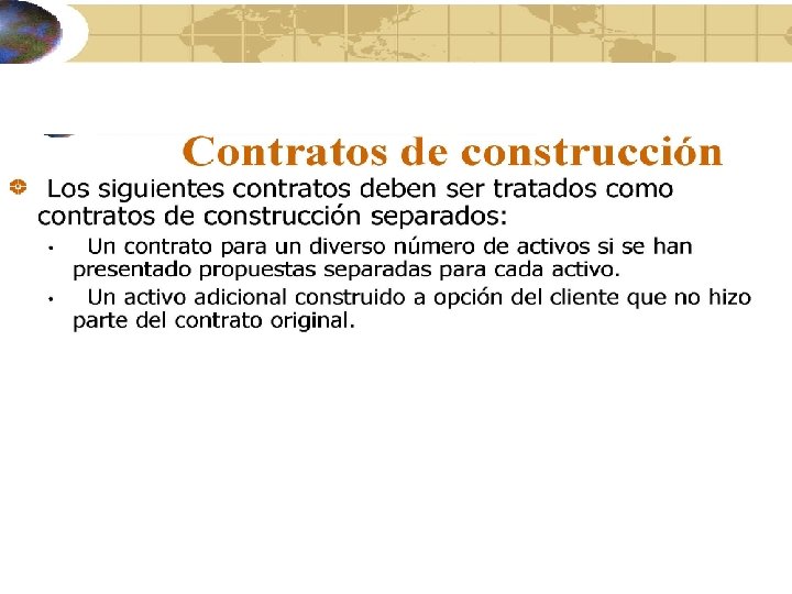 Contratos de construcción Los principios de IAS 11 son aplicados normalmente en forma separada a cada contrato negociado específicamente para la construcción de: • Un activo (por ejemplo, un puente) • Una combinación de activos que están estrechamente interrelacionados o son interdependientes en términos de su diseño, tecnología, función o uso (por ejemplo, plantas de producción especializadas) Un grupo de contratos debe ser tratado como un contrato de construcción singular, si éste fue negociado como un solo paquete.