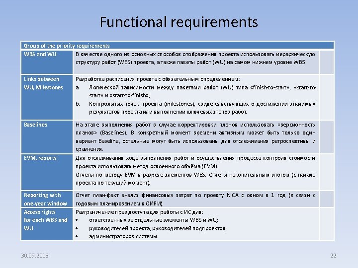 Why APT EVM is not a "front-end"? ü structural redundancy of functional elements, not user-friendly interface; ü serious differences between the principles of building the structure of the budget, for example, the absence of such a thing as an article of the budget at JINR; ü the system does not take into account the key feature of the JINR annual box planning, replanning within one year, no detailed plans before the end of the project; ü the assignment of values of spending funds on the level of work packages and not on the level of the work itself; ü Russian user interface absence. 30. 09. 2015 21