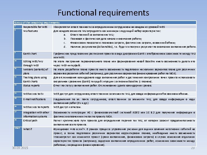 What basic functionality is implemented in PMIS? Ø WBS structure management and WU binding to the responsible persons; Ø Project works planning and replanning; Ø Versions of project plans (baselines); 30. 09. 2015 29