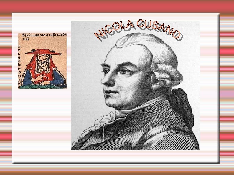 Nicola Cusano, nasce a Kues o Cusa, (oggi Bernkastel-Kues) nel 1401 da una ricca famiglia di mercanti ed armatori, muore a Todi nel 1464 durante la preparazione di una crociata indetta da papa Pio II contro i Turchi che avevano invaso Costantinopoli. Giurista, teologo, filosofo, politico, matematico e astronomo tedesco, fu tra i più autorevoli esponenti dell'Umanesimo europeo. Intraprese gli studi nel 1413 presso un movimento di spiritualità, i Fratelli della Vita Comune. Frequentò la Facoltà di Lettere dell’Università di Heidelberger nel 1416, completò gli studi a Padova dove si laureò nel 1423. Si perfezionò a Colonia e divenne dottore in filosofia. Nel 1433 Cusano fu invitato al Concilio di Basilea, nel quale ebbe un ruolo fondamentale; per l'occasione scrisse il De concordantia catholica: in questo scritto sostenne la necessità dell'unità della Chiesa Cattolica e la concordanza di tutte le fedi cristiane. Il 3 dicembre 1458 fondò nella città natale il Cusanusstift (Ospedale di San Nicola), un ospedale di carità in stile gotico Il 23 marzo 1450 Cusano fu eletto principe-vescovo di Bressanone. Nel 1459 Papa Pio II, recatosi al Convegno di Mantova, lo nominò Legato pontificio e Vicario di Roma, dove divenne un membro della Curia. Partecipò ai negoziati per porre fine alla Guerra dei Cent'anni tra la Francia e l'Inghilterra e agli accordi di Wiener Neustadt che gli avrebbero consentito di tornare a Bressanone. Cusano è figura di spicco nel travagliato momento storico che vide il tramonto della società medievale e l'alba dell'età moderna.