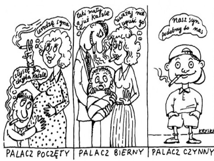 DANE: § w Polsce codziennie zaczyna palić pół tysiąca dzieci, § rocznie palenia próbuje około 180 tys. nieletnich, § do ukończenia 11 r. ż. ⅓ dzieci ma już za sobą eksperymentowanie z paleniem, § wśród piętnastolatków ¼ pali regularnie, § dzieci w Polsce wypalają rocznie 3 – 4 mld papierosów, § 4 mln dzieci wdycha biernie dym tytoniowy w domu lub miejscach publicznych, § w 67% gospodarstw domowych dzieci narażone są na dym tytoniowy.
