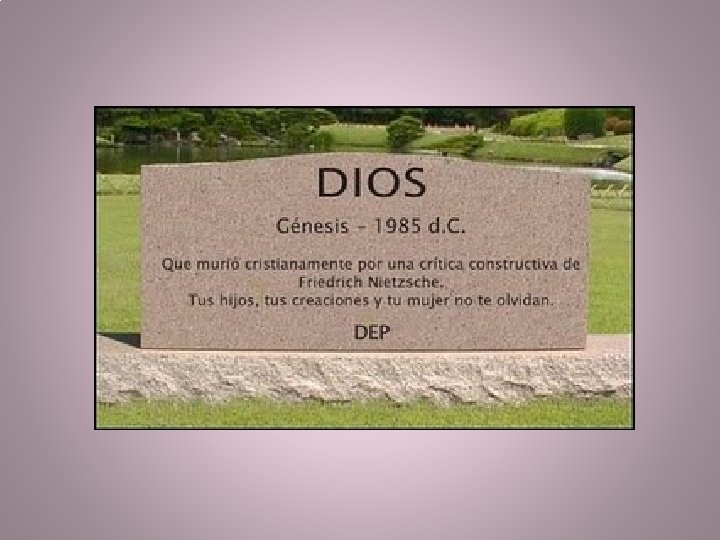 NIHILISMO • Nihilismo como decadencia vital: para Nietzsche toda cultura que crea en la existencia de una realidad absoluta, realidad en la que se sitúan los valores objetivos de la Verdad y el Bien, es una cultura nihilista. Toda la cultura occidental, es nihilista pues dirige toda su pasión y esperanzas a algo inexistente (el Dios cristiano, el Mundo Ideal y Racional de los filósofos), despreciando de modo indirecto la única realidad existente, la realidad del mundo que se ofrece a los sentidos, la realidad de la vida. En “Así habló Zaratustra” representa Nietzsche este modo de mostrarse el espíritu con la figura del camello, símbolo de la aceptación resignada de las mayores cargas.