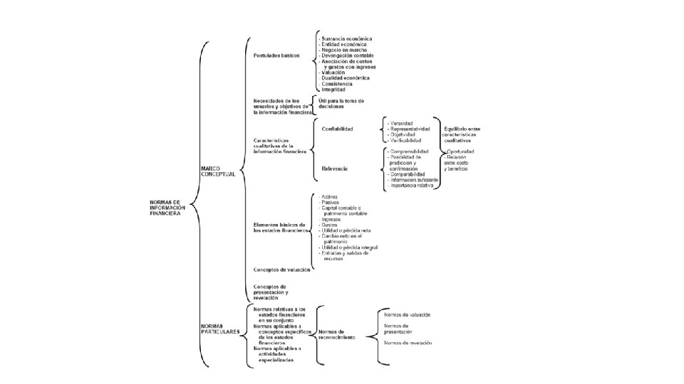 NIF Marco Conceptual Postulados básicos Necesidades de los usuarios Características de la información Elementos de los Estados Financieros Normas particulares Conceptos de valuación Conceptos de presentación y revelación De los estados financieros en su conjunto De partidas especiales en los estados De actividades especiales