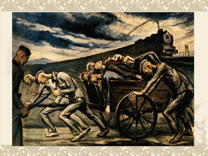 “Arrival of a Convoy” What is happening in this picture? A new convoy arrives in the background as inmates struggle with a cart carrying away cadavers from a previous convoy. What stands out to you in the picture? What does it tell you about the convoys that transported Jews to concentration camps? How did you come to these conclusions? [ Back to Art Menu ] [ Back to Main Menu ]