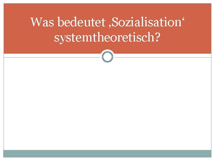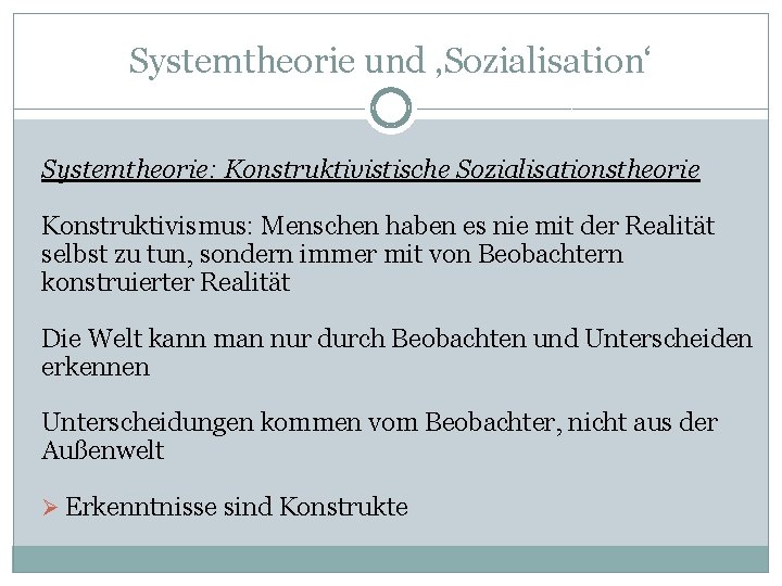 Systemtheorie und ‚Sozialisation‘ Systemtheorie: Konstruktivistische Sozialisationstheorie Konstruktivismus: Menschen haben es nie mit der Realität selbst zu tun, sondern immer mit von Beobachtern konstruierter Realität Die Welt kann man nur durch Beobachten und Unterscheiden erkennen Unterscheidungen kommen vom Beobachter, nicht aus der Außenwelt Ø Erkenntnisse sind Konstrukte