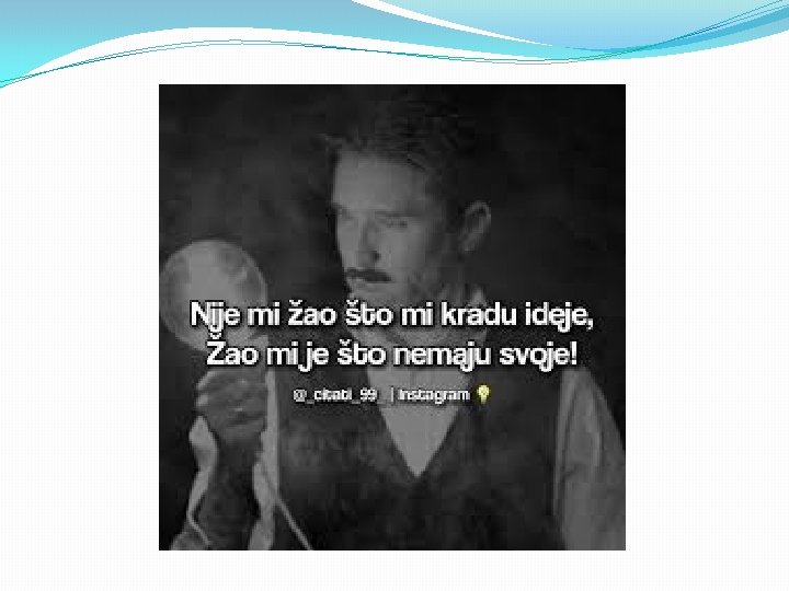 TESLINI CITATI �Neka budućnost kaže istinu, procijenite svakoga čovjeka prema njegovom radu i zaslugama. Sadašnjost je njihova, ali budućnost je moja, za koju sam tako naporno radio. (o svojim izumima i zaslugama) �Znanstvenici danas misle duboko umjesto jasno. Čovjek mora biti zdrav da misli jasno, ali se može misliti duboko i biti prilično lud. �Prije nego što sam napravim skicu na papiru, cijela ideja je razrađena mentalno. U mojem umu mijenjam konstrukciju, radim poboljšanja, pa čak i pokrećem uređaj.