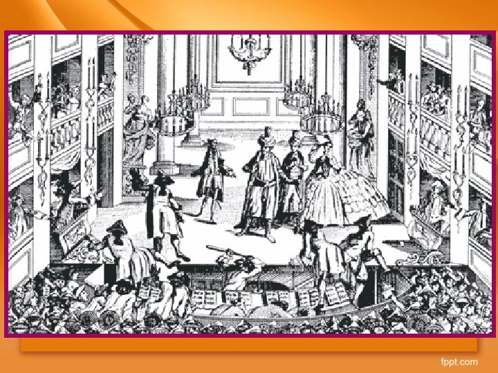 • The forestage was reduced, which increased the numbers in the pit. • The performance, which satrted at 6: 00 p. m. (halfprice for those coming after 8: 00), consisted of at least three pieces: the main piece – usually sendwiched between two others, one of which was the afterpiece. • Thus the entire performance lasted for four or five hours or longer. • It was no wonder that tragedy and comedy degenerated into crude melodrama and farce. • Polite society did not return to theatres until Victoria had reigned for some years.