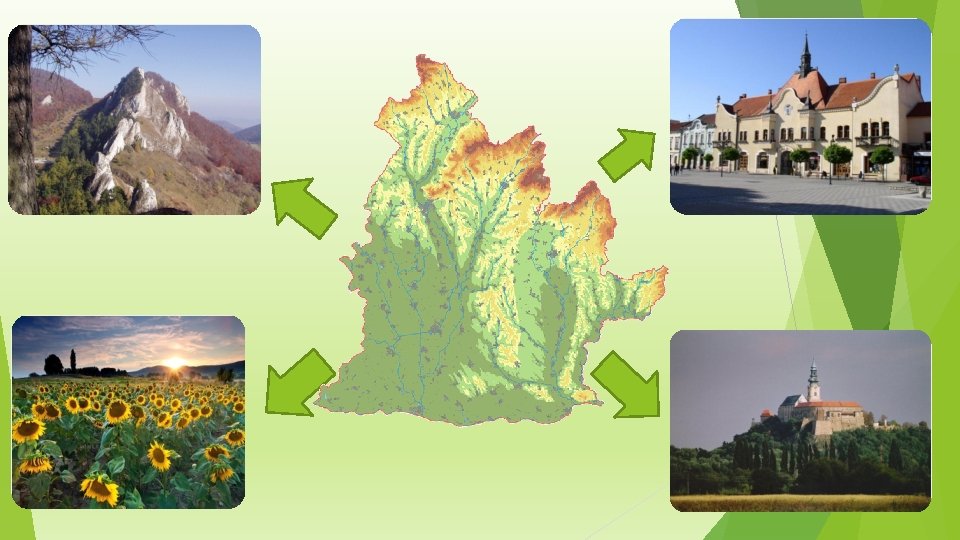 Prírodné podmienky Ø vypĺňa juhozápadnú časť Slovenska Ø nížiny: Podunajská nížina Ø pohoria: Považský Inovec, Tribeč, Pohronský Inovec, Burda, Štiavnické vrchy Ø podnebie: veľmi teplé a suché (okrem podhorských oblastí) Ø rieky: Dunaj, Ipeľ, Nitra, Žitava, Hron Ø výdatné podzemné vody = termálne kúpaliská Ø minerálne pramene: Santovka, Slatina Ø v nížinách lužné porasty – pôvodné dubové a lužné lesy vyrúbané a premenené na ornú pôdu