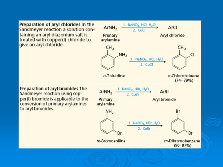 II. Reaction without extraction of N 2 : a) Formation of diazoderivatives C 6 H 5–N≡N–Cl + 2 Na. OH → C 6 H 5–N=N–ONa + Na. Cl + H 2 O C 6 H 5–N≡N–Cl + CH 3–NH 2 → C 6 H 5–N=N–NH–CH 3 + HCl C 6 H 5–N≡N–Cl + Na. CN → C 6 H 5–N=N–CN + Na. Cl b) Reduction (catalysts are Sn. Cl 2 and HCl) [H] C 6 H 5–N≡N–Cl + 2 Sn. Cl 2 + 4 HCl → C 6 H 5–NH– NH 2∙HCl + 2 Sn. Cl 4