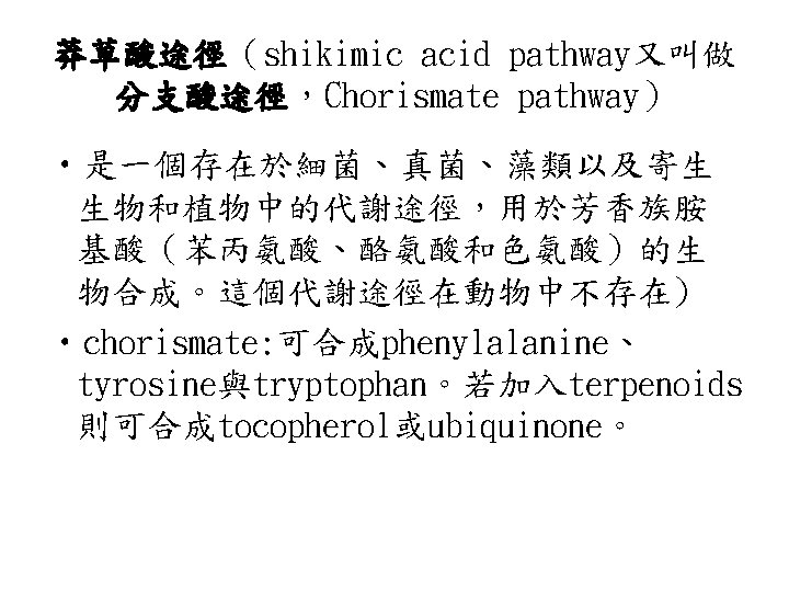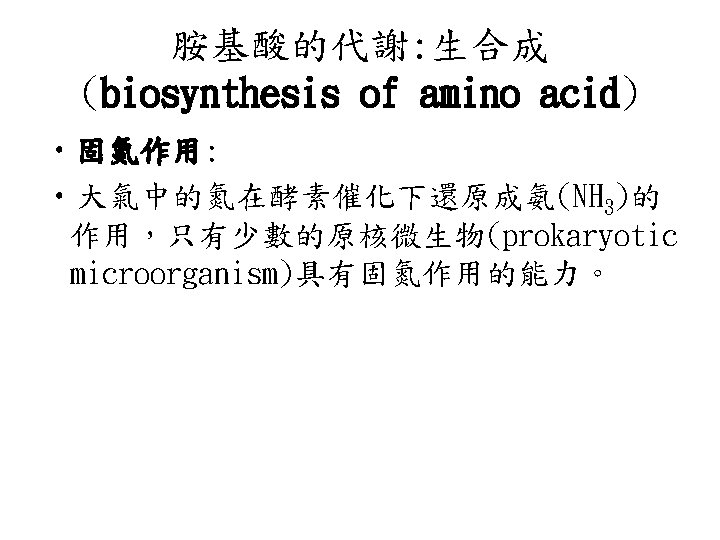 • 胺基酸的生合成途徑有一個共同特性: 它們 的碳骨架是由glycolysis、pentose phosphate pathway與citric acid cycle 的中間產物而來,可分為 6個族群。 • 1. Glutamate family: 以 -ketoglutarate 為先驅物,合成glutamate、glutamine、 proline與arginine。 • 2. Serine family: 以glycerate-3 phosphate為先驅物,合成serine、glycine 與cysteine這一族的成員在生合成 (anabolism)中扮演重要的角色。