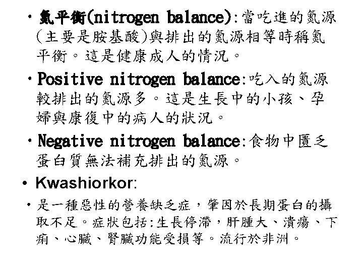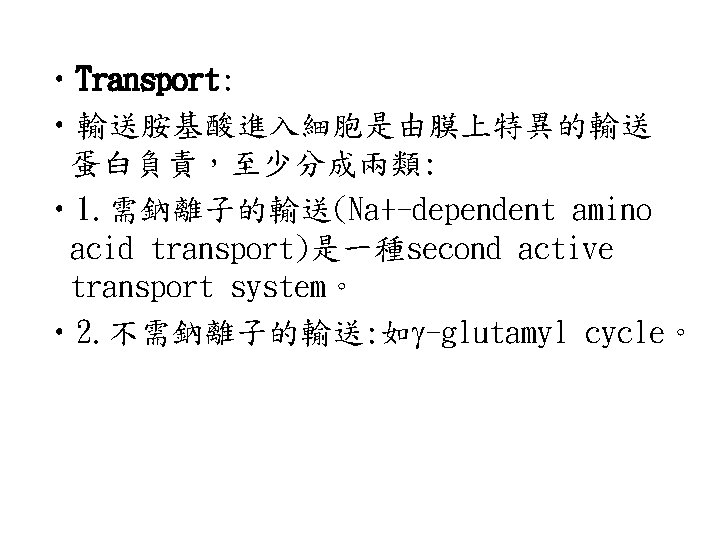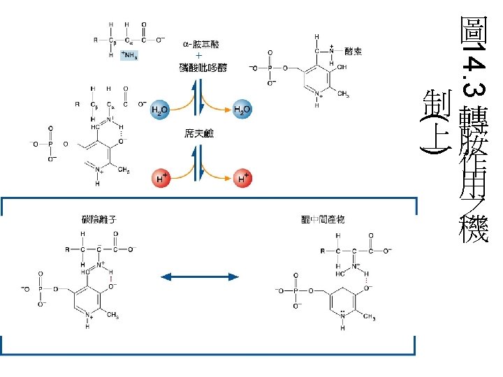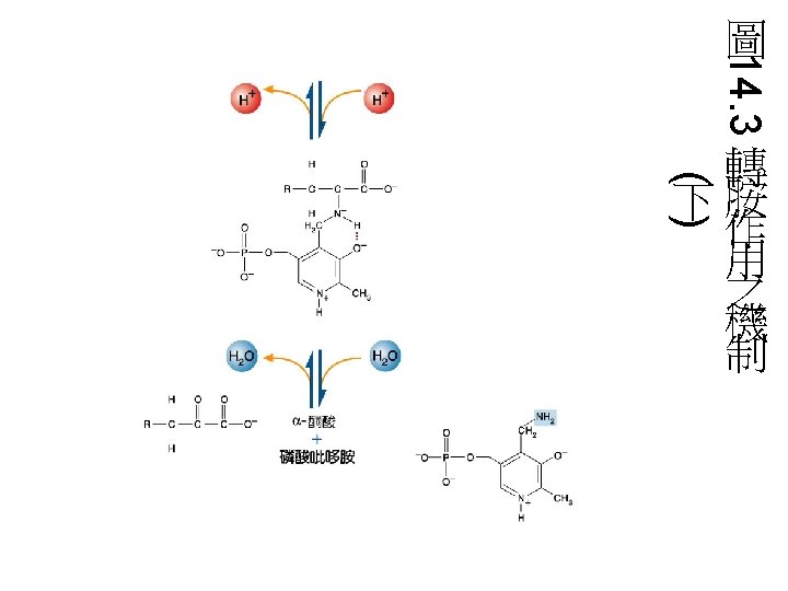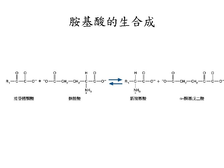 轉胺反應(transamination reaction): • 將 -amino acid的 -amino group轉給 keto acid。 • transamination是一個可逆反應,是胺基 酸合成與分解時所必需的反應。