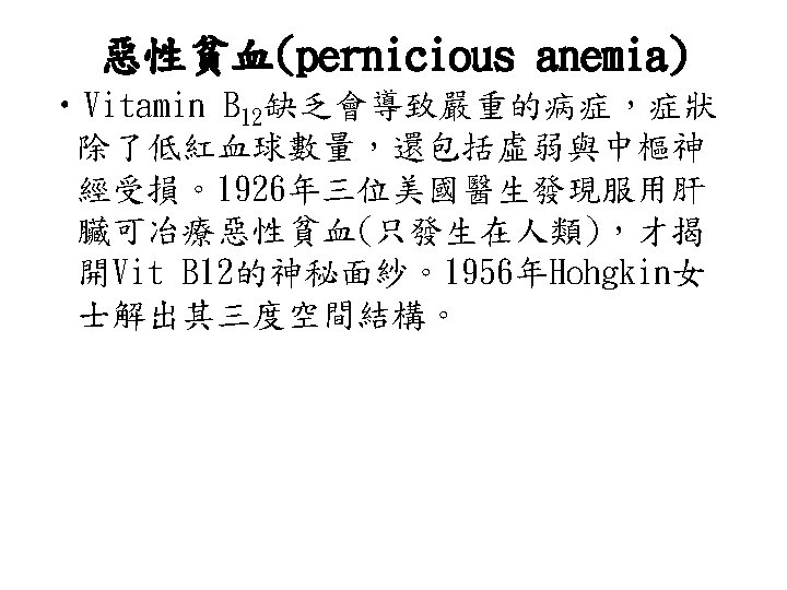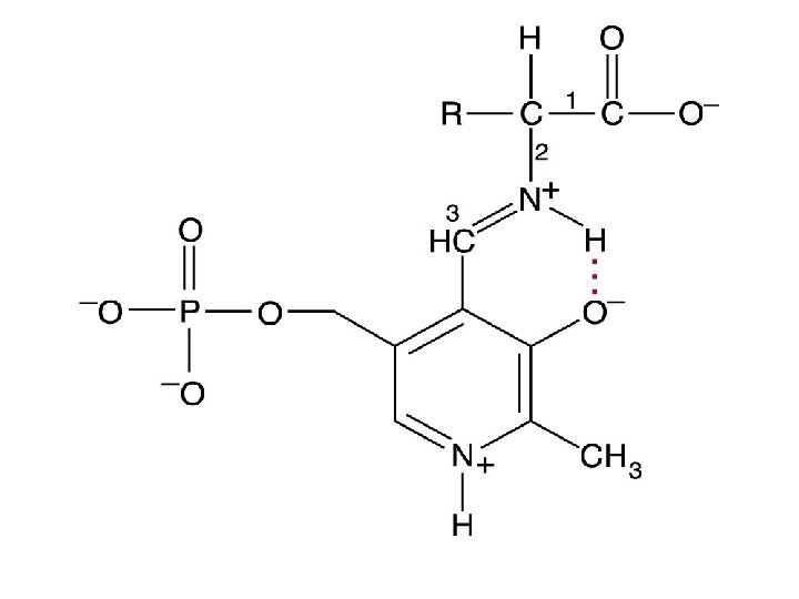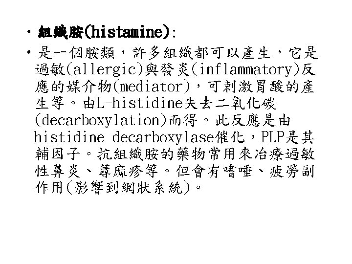 • pyridoxal-5 -phosphate(PLP): • 由pyridoxine(Vitamin B 6)組成是轉胺作用 的coenzyme。需PLP的酵素中,PLP是接在 Lysine residue上。PLP與胺基酸上的amino group結合形成中間物(intermediate)(如 圖),形成Schiff base