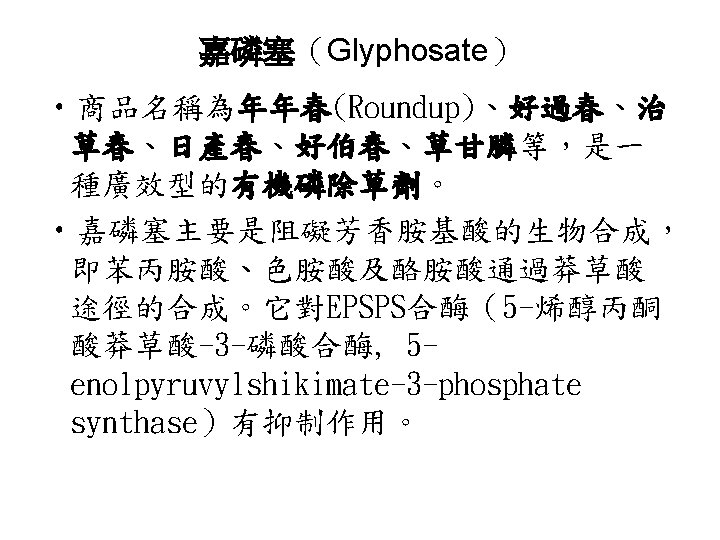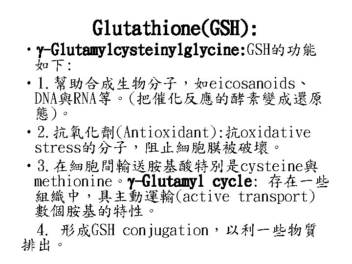 • Glycine是合成嘌呤(purine)、porphyrin( 紫質)、glutathione的先驅物(precursor)。 • Serine是合成ethanolamine與sphingosine 的先驅物。 • cysteine在硫代謝中具重要的角色。 • 3. Asparate家族: 以oxaloacetate為先驅 物,合成aspartate、asparagine、lysine、 methionine與threonine。 •