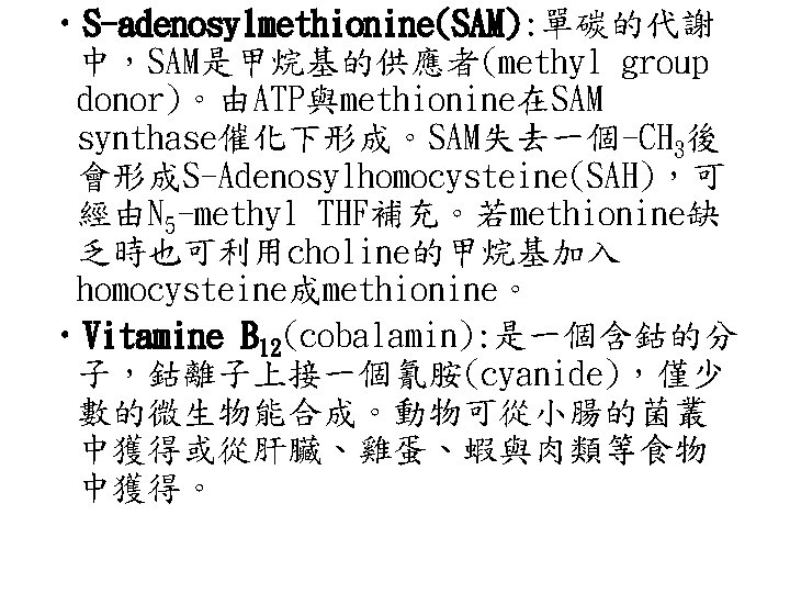 單碳的代謝(one-carbon metabolism) • 在生合成途徑(biosynthetic pathway)中, 最重要單碳的攜帶者(one carbon carrier) 包含(1)葉酸(folic acid) • (2)S-Adenosylmethionine。 • 另外Vit B 12也有此功能。