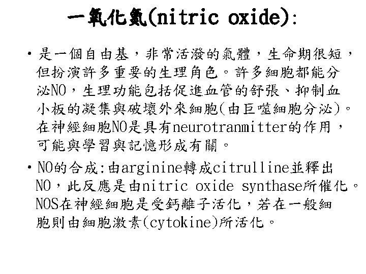 神經傳導物質 (neurotransmitters): • 具有激發性(excitatory)與抑制性 (inhibitory)效應: • Excitatory neurotransmitters: 如乙醯膽 鹼(acetylcholine)或glutamate等,能促 進被傳導的細胞膜去極化(depolarization) • ,能增加action potential。 • Inhibitory neurotransmitters: 如 glycine與GABA,會造成Repolarization即 抑制action potential的形成。