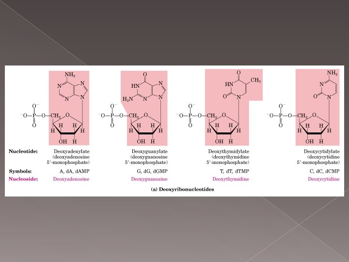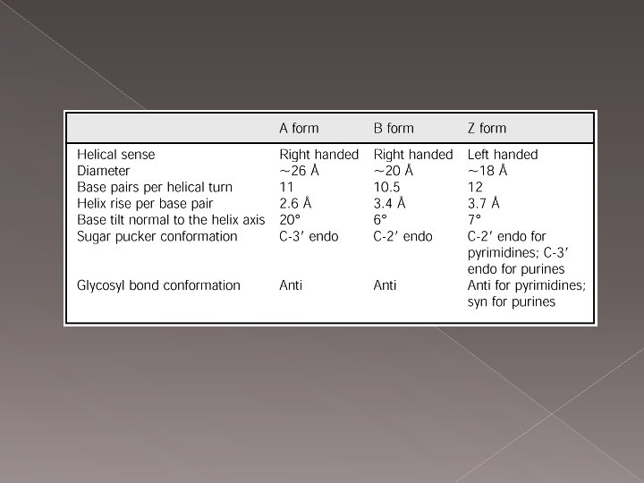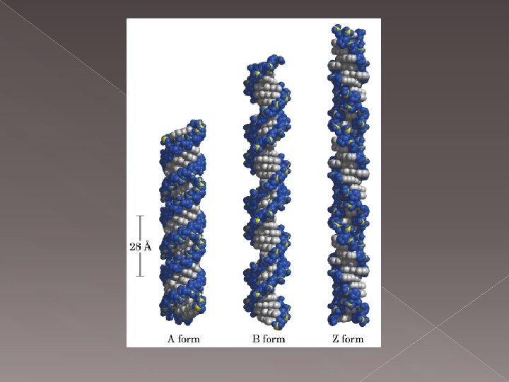 En çok bilinen DNA B tipinde A tip DNA, Z DNA, › hidrofilik grup yani deoksiriboz-fosfat iskeleti molekülün dış kısmında, › hidrofobik bazlar molekülün iç kısmındadır. › Sağ el heliks yapısındadır. › Heliksin 360˚ dönümünde 10, 5 baz çifti bulunur. › B formunun dehidratasyonu ile oluşur. › Sağ el heliks yapısındadır. › Heliksin 360˚ dönümünde 11 baz çifti bulunur. › › sol el heliks yapısındadır heliksin her 360˚ dönümünde 12 baz çifti bulunur. DNA nın gen ekspresyonu düzenleyen bölgelerinde bulunur. +2 değerli katyonlar ve pozitif yüklü küçük moleküller örneğin spermin, spermidin ile stabilize olur.