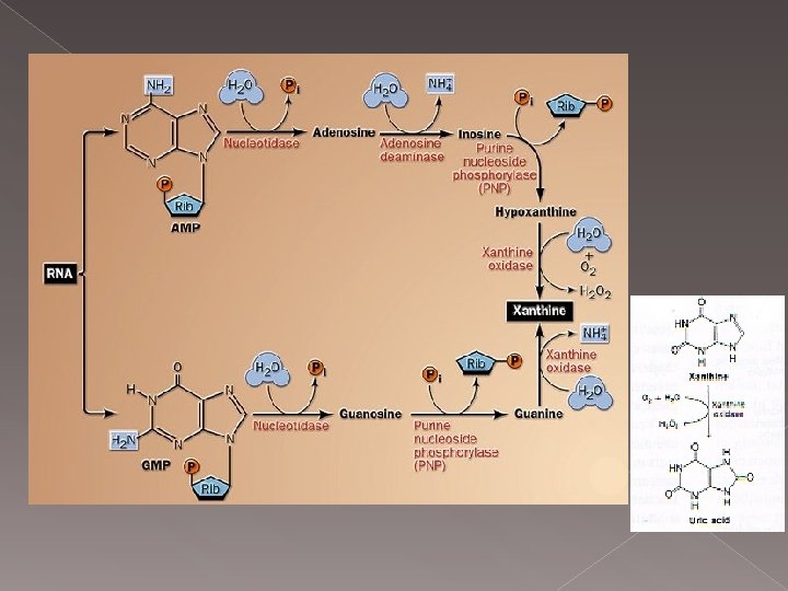 Pürin nükleotidlerinin yıkılımı 5 -nükleotidaz etkisiyle fosfat grubunun ayrılmasıyla başlar; pürin nükleozid fosforilaz etkisiyle sürdürülür; son olarak ksantin oksidaz etkisiyle ürik asit oluşur