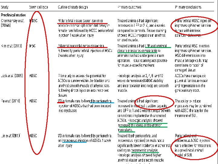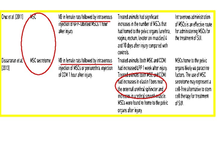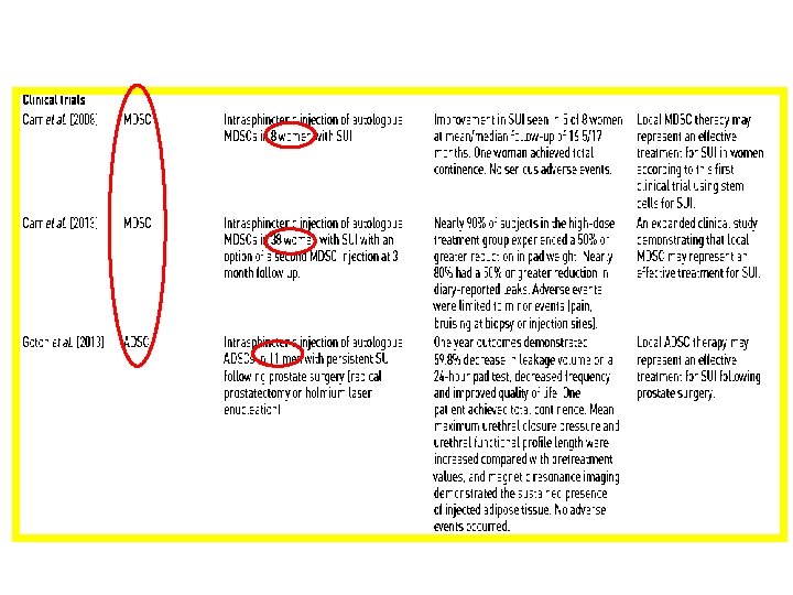 Lee ve arkadaşları; • 39 stres üriner inkontinanslı hasta • kord kanında elde edilmiş kök hücreleri • transüretral yoldan, Yapılan incelemelerde; • 39 hastanın 29'unda, %50 oranında subjektif iyileşme (+) • İntrensik sfinkter yetmezliği ve mikst stres inkontinansı olan 10 hastada da ürodinamide iyileşme izleniyor • Hiç Komplikasyon izlenmiyor