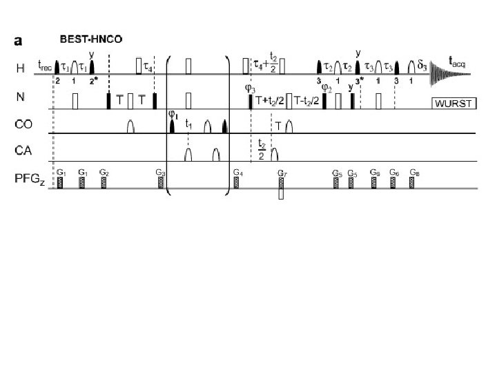 NMR I Pulsn NMR spinspinov interakce 13 C Slides: 22 Download presentation NMR I Pulsní NMR, spin-spinové interakce, 13 C NMR CW (continuous wave) z z Pulsní NMR B o Mo x Bo B 1 wo x Mxy y y wo z z x Mxy Mo rovnováha. . . x wo y y z x Bo Mxy čas wo y Přijímací cívka (x) NMR signál FID (Free Induction Decay) – Fourierova transformace - Spektrum FT w čas FT Nejdůležitější pulzy z Mo z x p/2 x Mxy y y z Mo y z x p x y -Mo Pulzní sekvence 1 H z Mo z x x 90 y puls y Mxy y 90 y akvizice 90 y 1 H: n Nepřímá spin – spinová interakce Cl 1 H e e e 13 C Cl Cl aa ab ba bb a b 13 CH aaa aab aba baa abb bab bba bbb 13 CH 3 1 1 2 1 1 3 3 1 1 4 6 4 1 2 1 H CCl 4 CHCl 3 CH 2 Cl 2 CH 3 Cl 13 C Dekaplink, 13 C pulsní sekvence 90 y 13 C: t. D 1 {1 H} 1 H: Dekaplink 1 H CH 3 Cl 13 C satelity 13 C NMR - alkany X-Ca. H 2 -Cb. H 2 -Cg. H 3 X d(Ca) d(Cb) d(Cg) H 16, 1 16, 3 16, 1 CH 3 24, 9 13, 1 NH 2 44, 6 27, 4 11, 5 OH 64, 9 26, 9 11, 8 NO 2 77, 4 21, 2 10, 8 F 85, 2 23, 6 9, 2 Cl 46, 7 26, 0 11, 5 Br 35, 4 26, 1 12, 7 I 9, 0 26, 8 15, 2 Indukční efekt, mezomerní efekt, g-efekt, efekt těžkého atomu 13 C NMR - cykloalkany d Cyklopropan -2, 8 Cyklobutan 22, 4 Cyklopentan 25, 8 Cyklohexan 27, 0 cykloheptan 28, 7 13 C NMR - alkeny d ≈ 100 - 150 13 C NMR - alkyny H 71, 9 Alkyl 84, 0 68, 6 CH 3 CH 2 O 89, 6 23, 4 13 C NMR - areny d ≈ 120 - 140 13 C NMR – karbonylové a karboxylové sloučeniny Aldehydy, ketony d ≈ 190 – 220 Deriváty karboxylových kyselin d ≈ 160 – 180 APT C, CH 2 CH, CH 3 DEPT CH 3 CH 2 CH DEPT CH 3 CH 2 CH