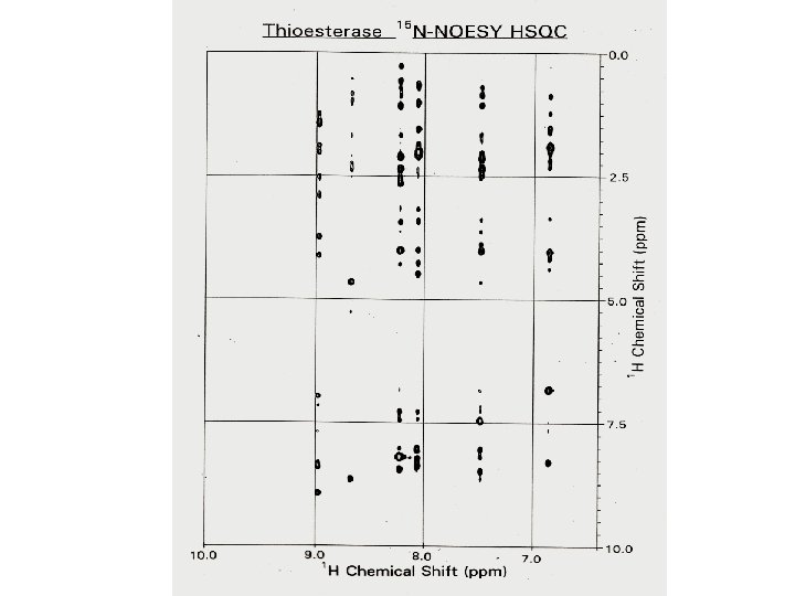 COSY: (MQF-COSY; DQF-COSY) 1. Off-diagonal resonances due to 1 JNHC one bond J-coupling. 2. Assign adjacent resonances. 3. One can select a magnetization transfer pathway (efficiency) by varying the evolution time. TOCSY: ( HOHAHA) 1. Off-diagonal resonances due to relayed J-coupling. 2. Magnetization transfer thru Hartmann-Hahn cross polarization. 3. Assign long range correlated resonances (Whole a. a. system). NOESY: 1. Off-diagonal resonances due to NOE. 2. Magnetization transfer thru energy transfer due to thru space dipolar effect. I R-6 Determine distances. 3. Sequential resonance assignments.