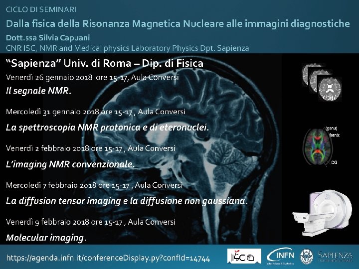 NMR Laboratory Dalla fisica della Risonanza Magnetica Nucleare alle immagini diagnostiche Silvia Capuani *CNR-ISC UOS Roma Dipartimento di Fisica Sapienza Università di Roma Laboratorio di Risonanza Magnetica Nucleare Edificio Fermi stanza 319, Edificio Segre’ Laboratorio 5 silvia. capuani@roma 1. infn. it