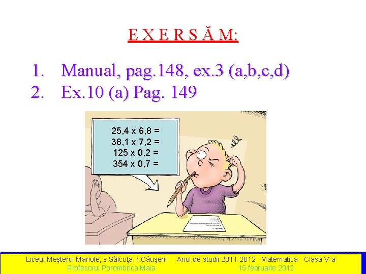 Dacă este nevoie, partea zecimalăse completează cu zerouri : х 0, 254 0, 03 0, 00762 3+2 х 18 0, 0006 0, 0108 4 Comparaţi : 4, 2 · 3, 5 = 14, 7 > 4, 2 Şi. . . 4, 2 · 0, 35 = 1, 47 4, 2 · 1 = 4, 2 1, 47 < 4, 2 ПОЛУЧИ ВИДЕОУРОКИ ПО МАТЕМАТИКЕ ДЛЯ 5 -11 КЛАССОВ БЕСПЛАТНО (!!!) И ИСПОЛЬЗУЙ Liceul Meşterul Manole, s. Sălcuţa, r. Căuşeni Anul de studii 2011 -2012 Matematica Clasa V-a. ИХ НА СВОИХ УРОКАХ ИЛИ Porombrica РАЗДАЙ СВОИМ на последнем Profesorul Maia УЧЕНИКАМ! ((подробности 15 februarie 2012 слайде))
